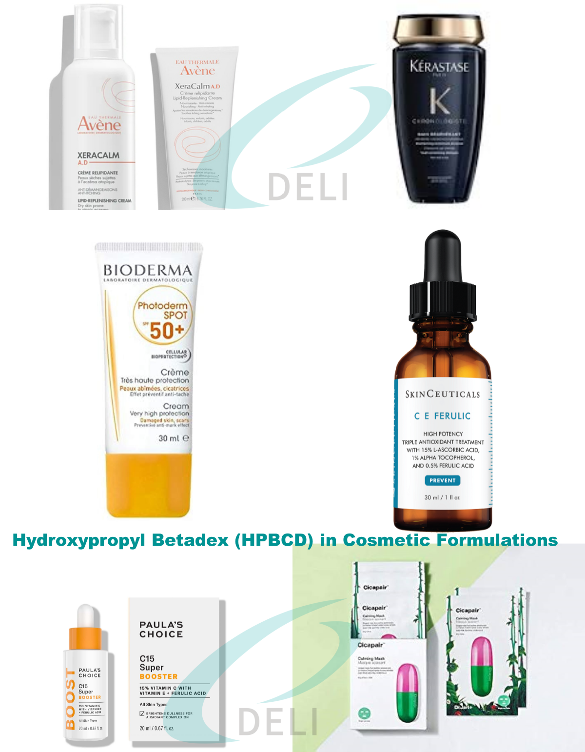 Faoi láthair, ní nochtann go leor brandaí cosmaideacha agus cúram craicinn go mion na comhábhair shonracha (m.sh., hiodrocsapropyl betacyclodextrin, HPBCD) a úsáidtear ina bhfoirmlithe, rud a fhágann go bhfuil sé níos deacra na táirgí sonracha go léir a úsáideann HPBCD a liostú go cinntitheach. Mar sin féin, bunaithe ar litríocht, paitinní agus foinsí tionscail atá ar fáil go poiblí, is iad seo a leanas roinnt catagóirí agus samplaí agus samplaí de tháirgí cosmaidí agus cúram craicinn a úsáideann HPBCD:
