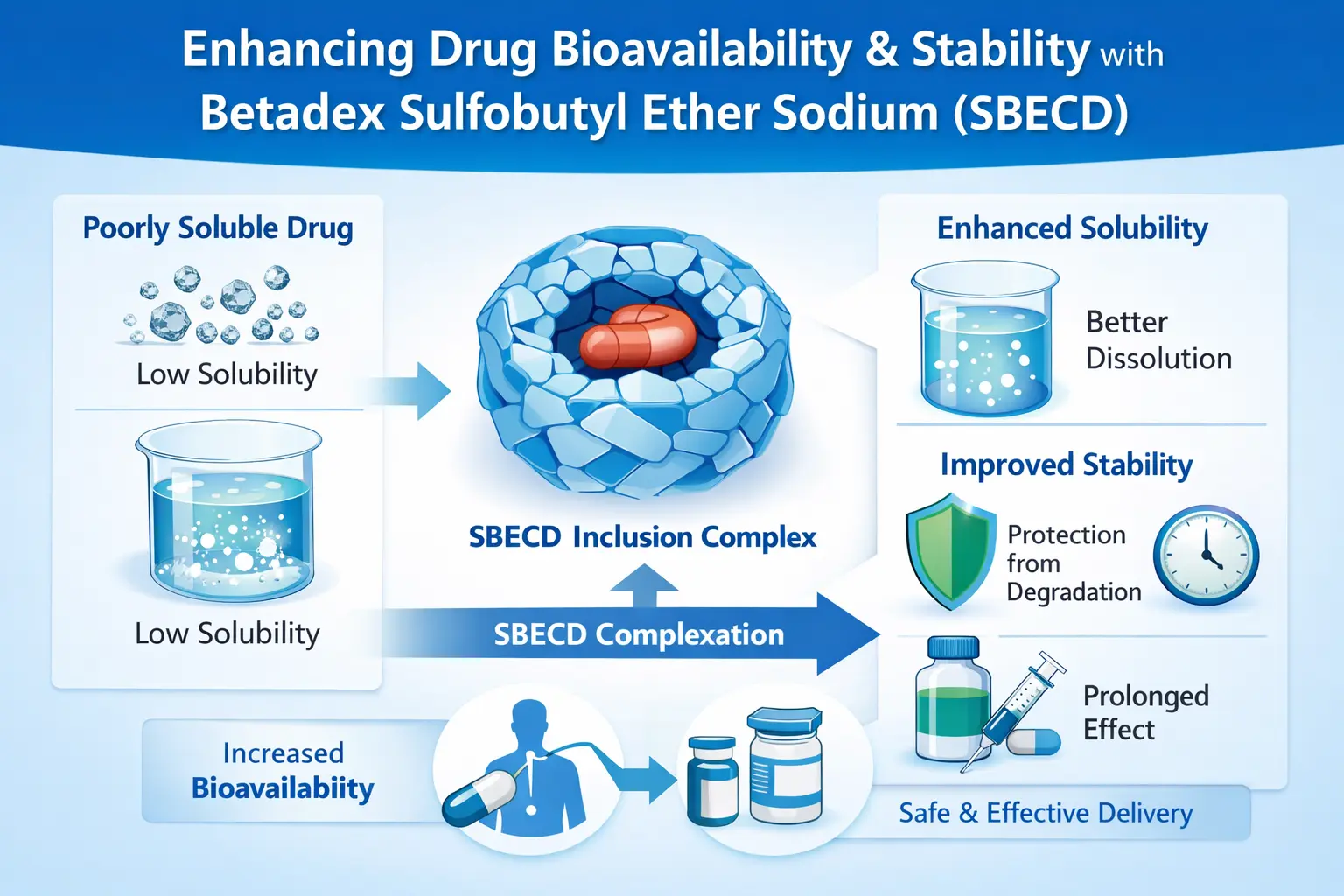 Cuidíonn struchtúr ceimiceach uathúil SBECD leis déileáil leis an bhfadhb seo. Déanann cnámh droma cyclodextrin spás do mhóilíní drugaí atá hidreafóbach, agus déanann na grúpaí éitear sulfobutyl an-éasca don druga a dhíscaoileadh in uisce. Toisc go bhfuil dhá airí aige, is bealach iontach é SBECD chun drugaí a sheachadadh.